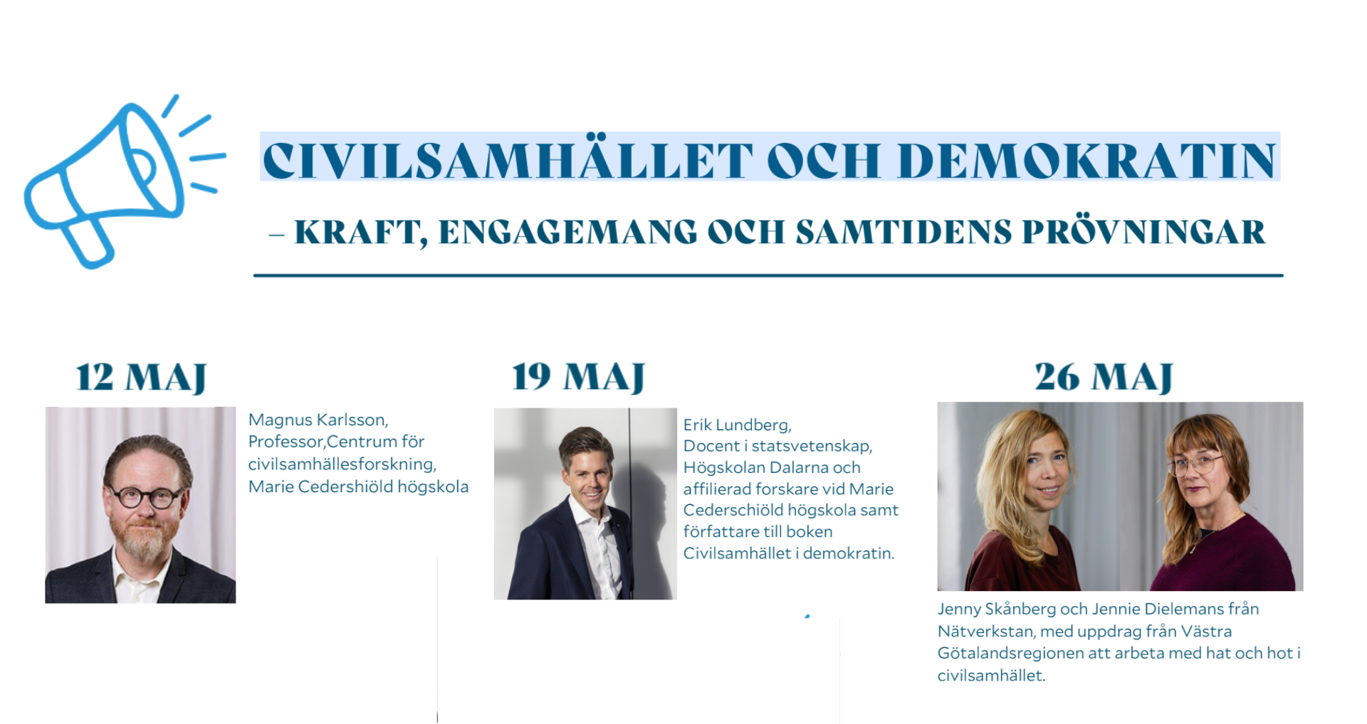 I en tid av förändrade politiska villkor, nya former för ideellt engagemang och ett hårdare samhällsklimat står ideella organisationer och demokratin inför nya utmaningar. Under tre föreläsningar belyses hur synen på civilsamhället har förändrats, vilken roll engagemanget spelar för demokratin samt hur hat och hot påverkar det offentliga samtalet.